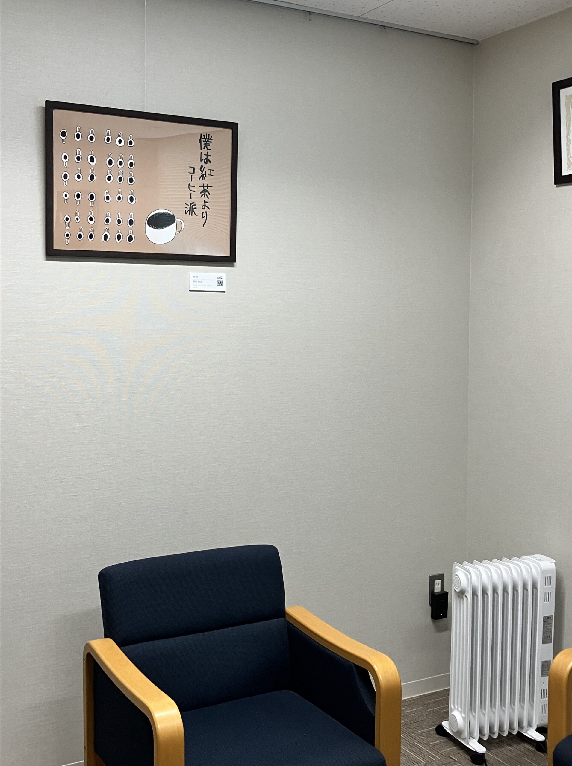 また、面会室には大小たくさんのコーヒーカップが並んだとってもユニークな作品を展示していただきました。作者は紅茶よりもコーヒーがお好きのようです。
