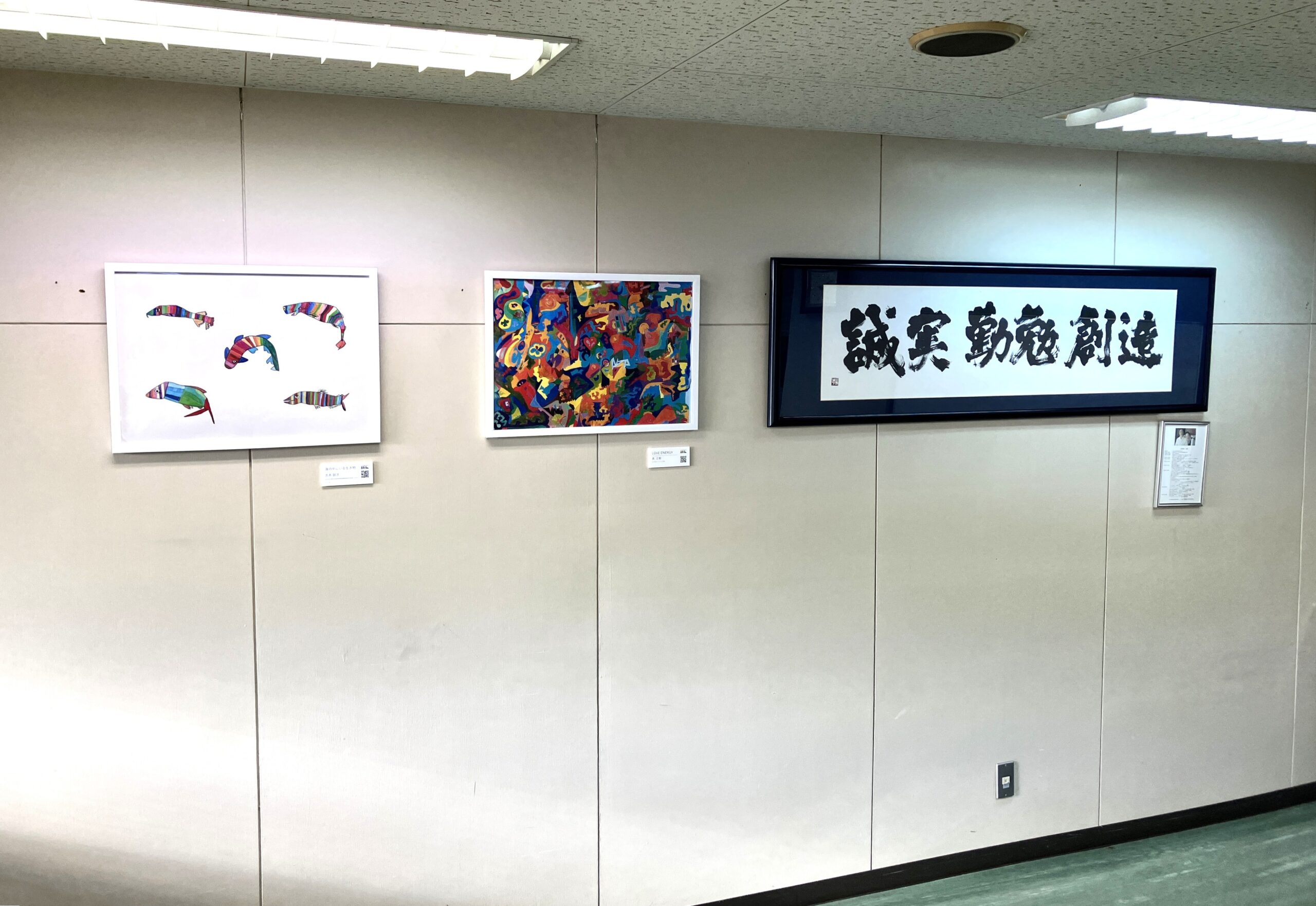 学校に入ってすぐのエントランスと1室に、全部で3作品を展示しました。今回は、明るくポップな色使いの作品をお選びいただきました。前向きなエネルギーや楽しさが伝わってきます。学校を訪れる人や生徒の皆さんなど、見る人の心を明るくしてくれるのではないでしょうか。