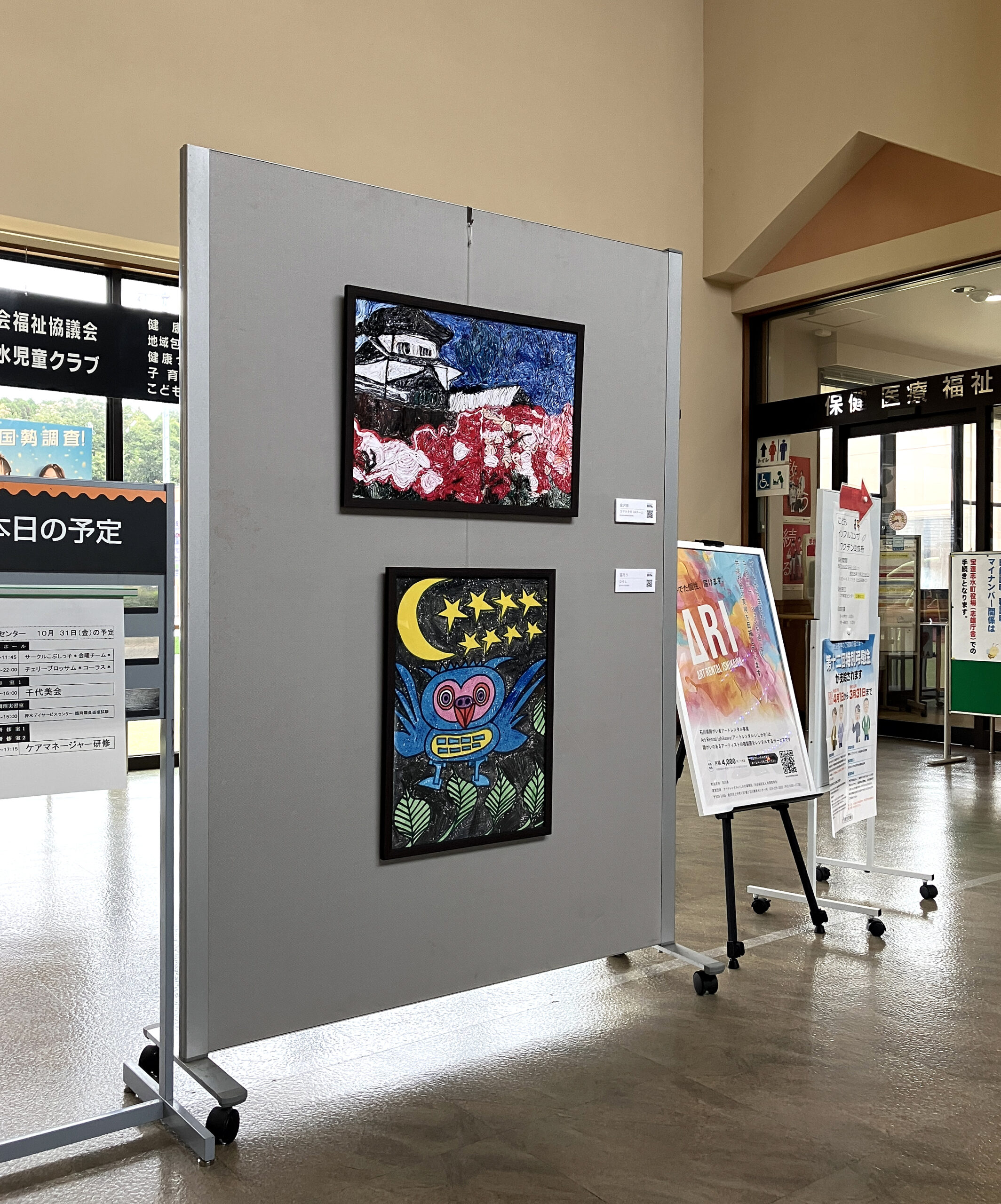 正面玄関のパネルに2作品を展示しています。お近くにお寄りの際はぜひご鑑賞ください。