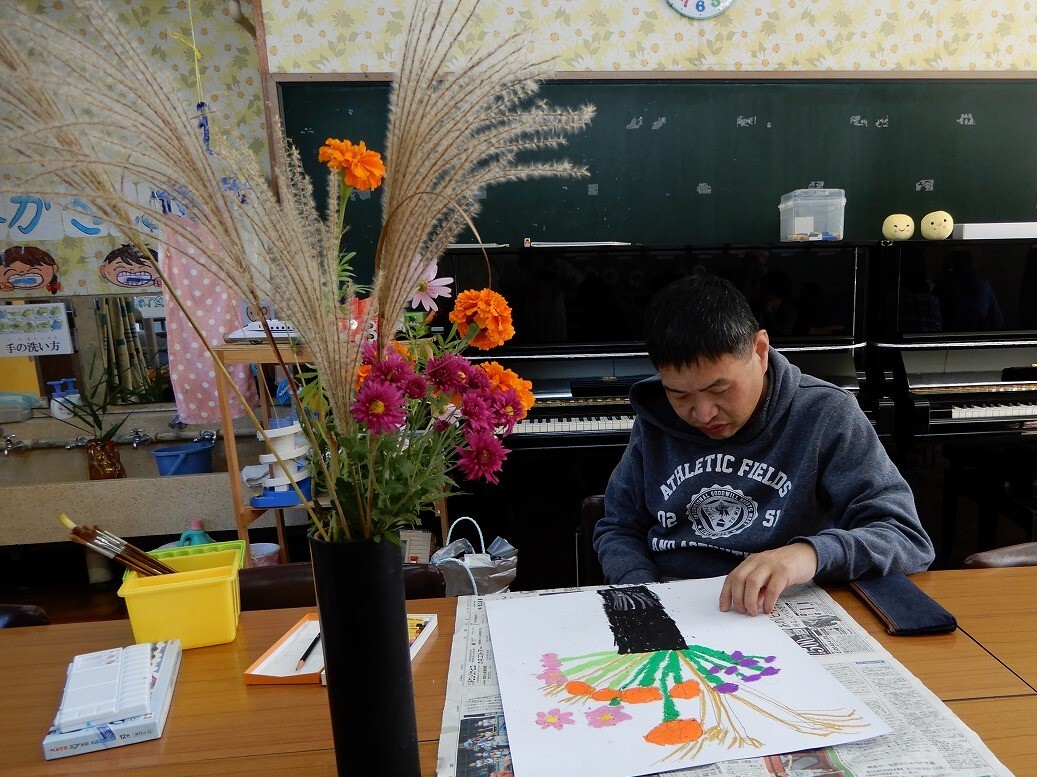 七尾鹿島手をつなぐ育成会の絵画教室で絵を描いています。