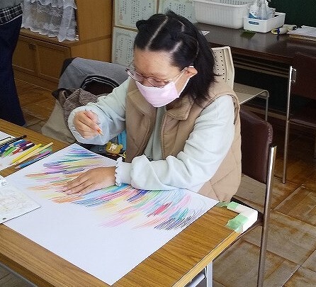 私は絵を描くのが大好きです。石川県手をつなぐ育成会のアールブリュット展に事業所から出展したとき、地元の育成会の人に絵画教室に誘われました。最初は恥ずかしかったけど、絵を描くのが大好きなのでこれからも仲間の人と一緒に続けていきたいです。今回は虹を画面いっぱいに描いてみました。