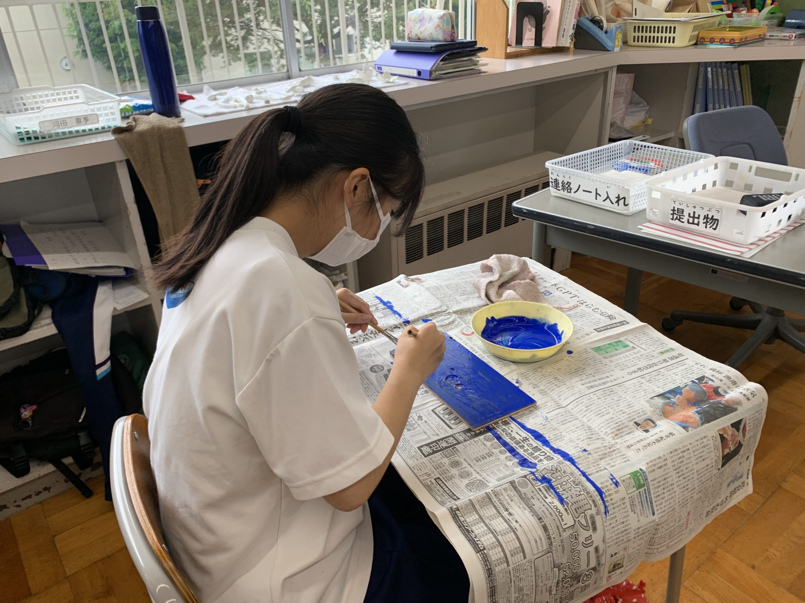 この作品は学校の美術の時間に描きました。絵を描くのは苦手ですが、この作品はインクを自由に落としながら描いていくので、楽しみながら描けました。インクが混ざって色が変化し、山や海のような自然を思わせる深い色合いになったところを気に入っています。