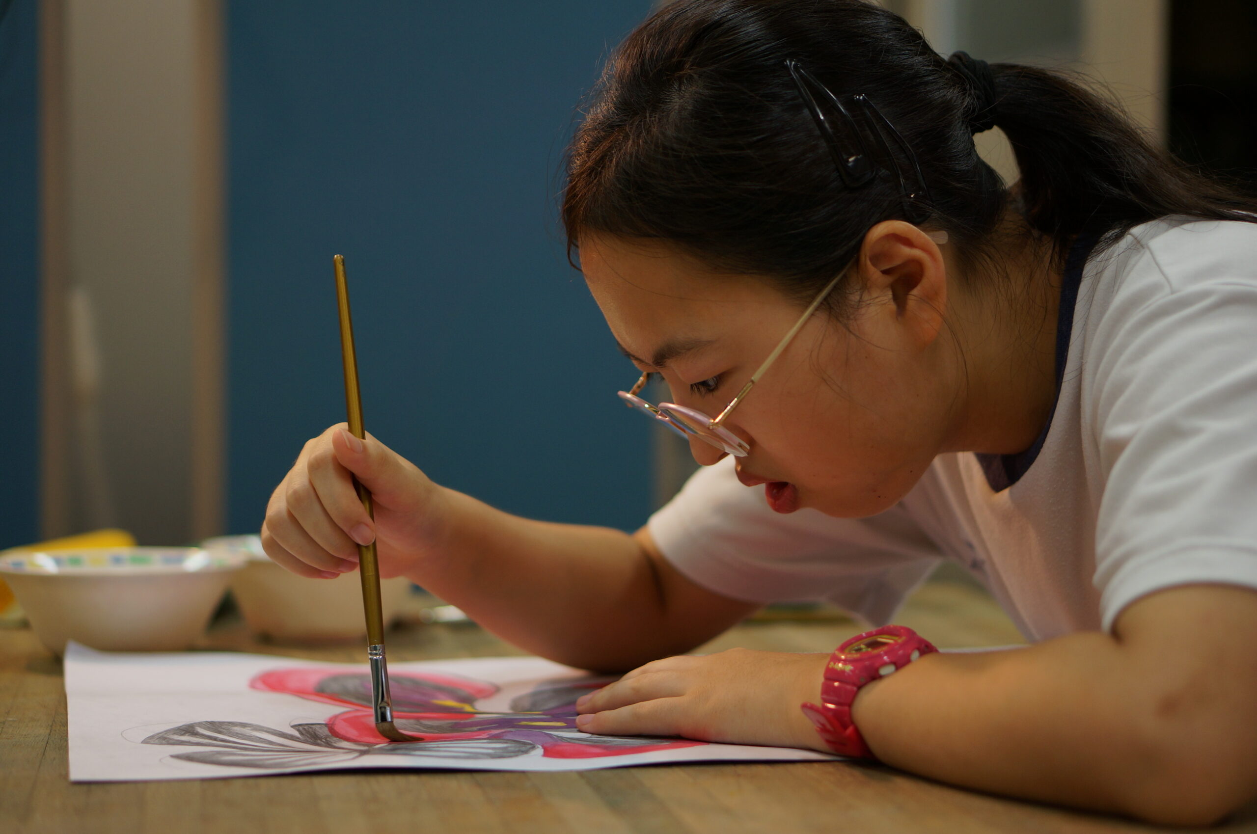 私がなぜ「サル」を描こうと思ったかというと、サルの目や、サルの顔のかわいらしさを表現したかったからです。サルの顔を見たときに、顔が「キリっ」としていたり、びっくりしていたりする顔がとてもかわいいと思ったからです。また、シンプルな絵のサルも良いけれど、色をつけて、もっとかわいらしいサルにしたいと思ったので、カラフルなサルにしました。